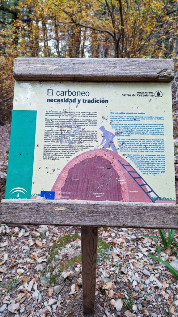 Seguimos por el bosque de pinsapos y empezamos a descender hasta situarnos 500 m por debajo de las verticales Caídas del Torreón. Aquí observamos viejos y altos ejemplares de pinsapos, junto a otros muertos, y aparecen dos paneles informativos. Primero uno sobre el carboneo tradicional (actividad que desapareció desde que el Estado compró la zona en 1972), y luego otro sobre la evolución del pinsapar hacia la madurez, donde se nos explica que la madera en descomposición permite la regeneración del bosque. Por la misma zona el sendero se ensancha y se convierte en pista forestal. Aparecen también viejos quejigos de troncos retorcidos y musgosos, como el «Quejigo del Gnomo».