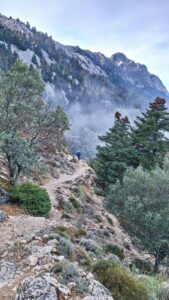 Seguimos el sendero y algo más adelante entramos en el bellísimo bosque de pinsapos de la Sierra del Pinar. Pasaremos algunos tramos con tajos a la derecha (aunque sin excesivo peligro), por lo que debemos caminar con precaución. En los espacios abiertos, disfrutaremos de espléndidas panorámicas de las impresionantes Caídas de la Sierra del Pinar. Atravesaremos varias torrenteras y pedreras, donde la fuerte erosión del agua y las rocas en las pendientes laderas crean un paisaje muy especial, con desprendimientos de rocas y árboles arrastrados de forma caótica.