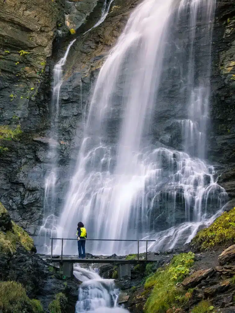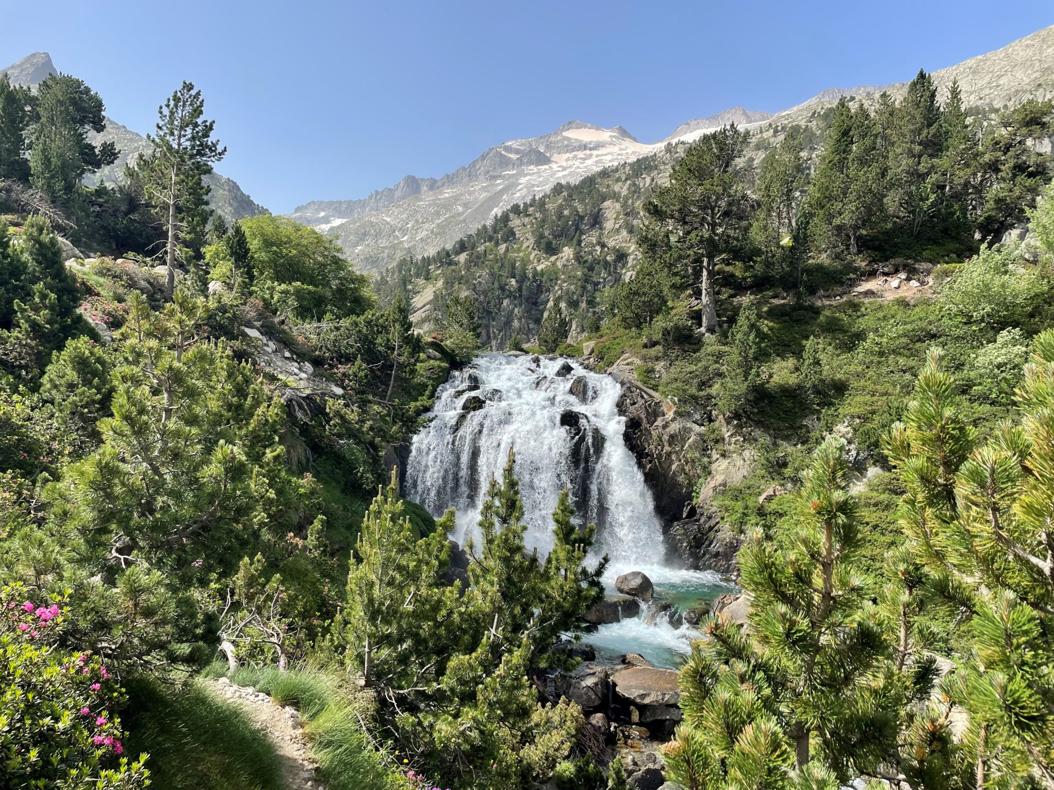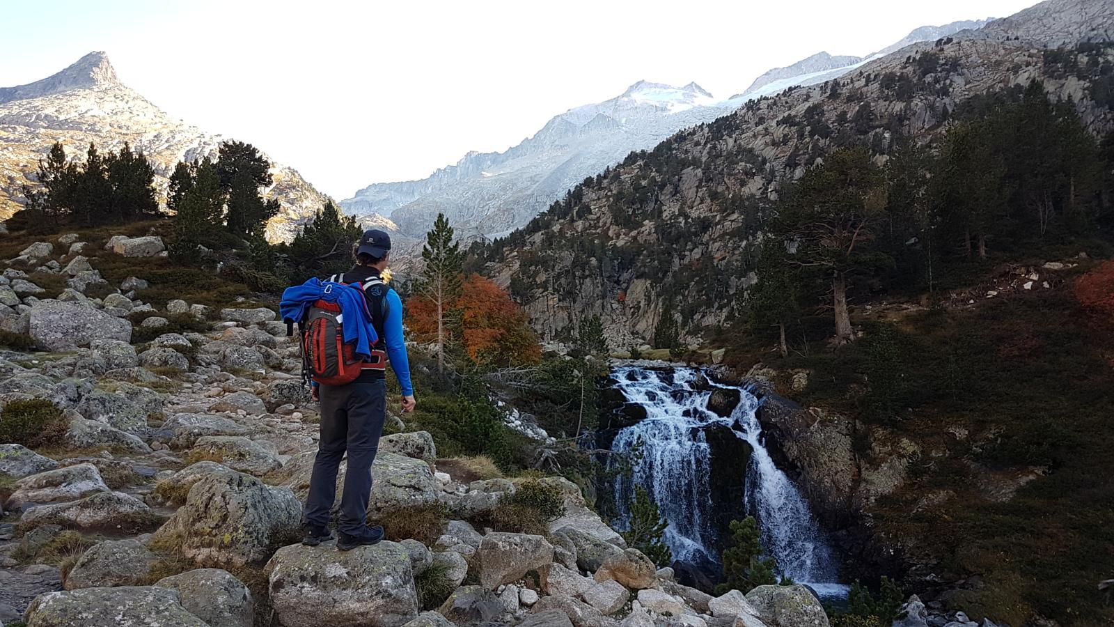 Hay un puente al fondo del valle, justo casi debajo de esta primera espectacular cascada de Ardonés,cerca, ya en el otro lado del valle, se pasa por otras dos cascadas, la del Clotet y de la Mascarada.
