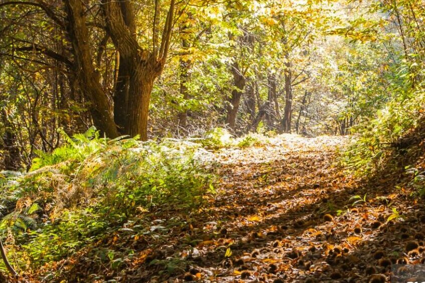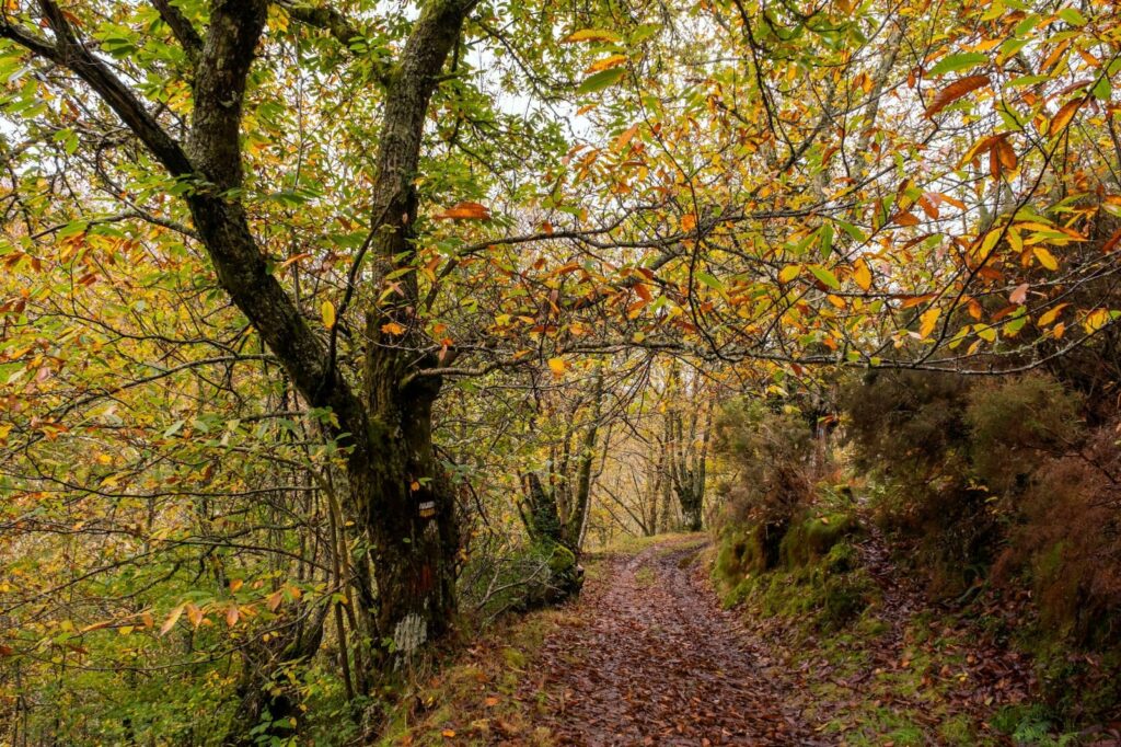 La ruta no solo es visualmente impactante, sino que también está llena de vida. Es probable que veamos aves autóctonas volando entre los árboles y escucharemos el suave murmullo del viento entre las hojas. En esta época del año, el suelo está salpicado de castañas caídas, lo que añade un toque especial a nuestra caminata.