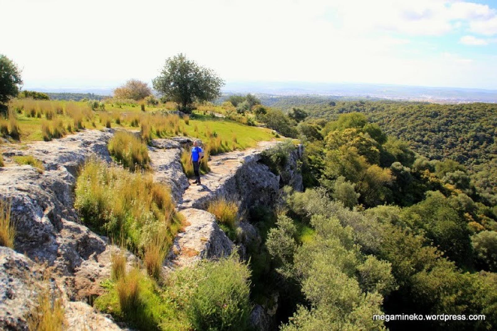 la Meseta Blanca. El ascenso combina: Roca caliza Conglomerados  y de pronto… se abre el paisaje. arriba nos espera , Una gran superficie plana y blanca con cortados abruptos hacia los arroyos y vistas abiertas de Sierra Morena