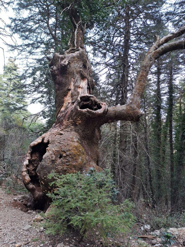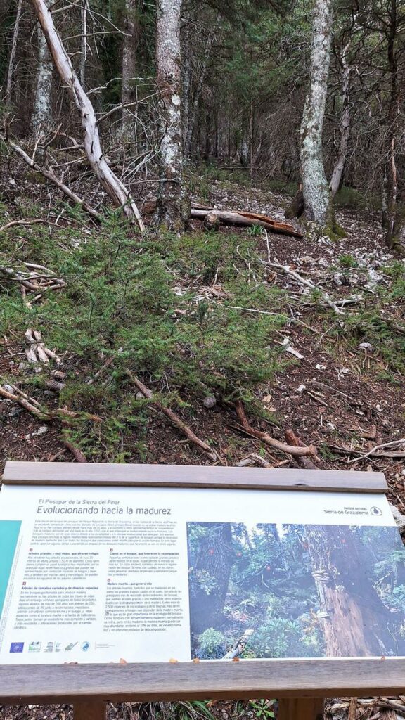 Seguimos por el bosque de pinsapos y empezamos a descender hasta situarnos 500 m por debajo de las verticales Caídas del Torreón. Aquí observamos viejos y altos ejemplares de pinsapos, junto a otros muertos, y aparecen dos paneles informativos. Primero uno sobre el carboneo tradicional (actividad que desapareció desde que el Estado compró la zona en 1972), y luego otro sobre la evolución del pinsapar hacia la madurez, donde se nos explica que la madera en descomposición permite la regeneración del bosque. Por la misma zona el sendero se ensancha y se convierte en pista forestal. Aparecen también viejos quejigos de troncos retorcidos y musgosos, como el «Quejigo del Gnomo».