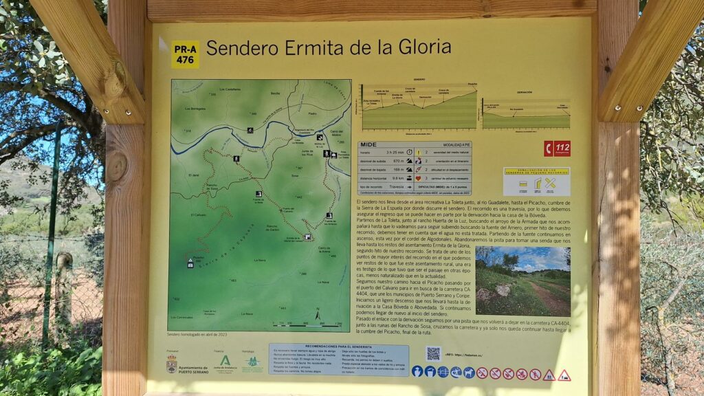 Preciosa ruta circular por uno de los valles mas emblemáticos de la sierra de Cádiz . Concretamente ruinas de la Ermita de la Gloria en el Cordel Algodonales. La ruta tiene interés paisajístico, geográfico, histórico y etnográfico. En efecto, en esta zona, se produce la confluencia con el Guadalporcún, se ha encontrado un yacimiento prehistórico del Solutrense, veremos vegetación de ribera y de tipo mediterráneo, explotaciones agropecuarias, las ruinas de una ermita del siglo XVIII, los restos de una pequeña presa sobre el Guadalete, un antiguo molino, etc.
